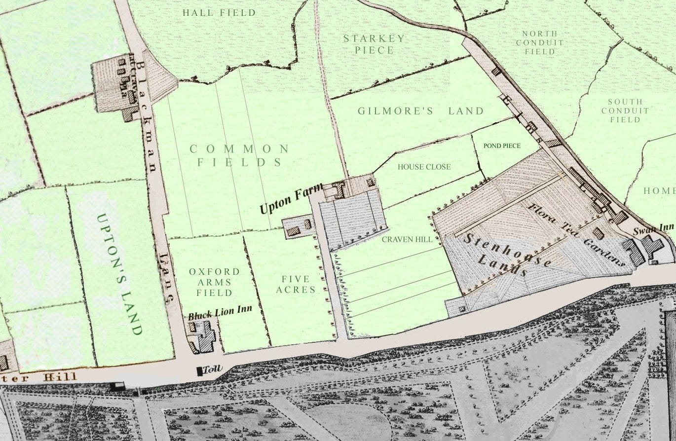 The walk along Craven Hill Gardens would have in former times taken us through the farmyard of Upton Farm. This farm managed the fields hereabouts and, apparently, had a delightful tree-lined lane connecting it to Bayswater Road. Blackman Lane on the map above is the future Queensway.