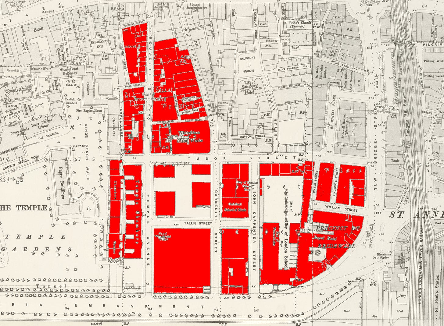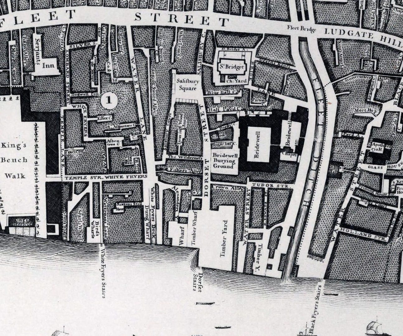 Then there was a extension north bounded to the east by Water Lane (1746 name)/Whitefriars Street (1897 and current name).
