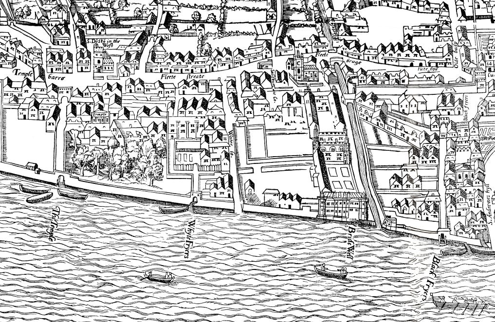 Of course the great rivals of the White Friars were the Black Friars who were Dominican and wore the black cappa. They moved their 1220s-founded priory at the top of Shoe Lane (modern Holborn Circus) a few hundred metres south to be between the tidal Thames and the west of Ludgate Hill in about 1276.