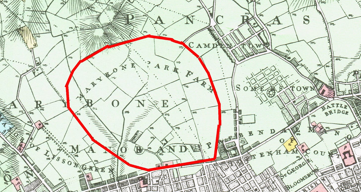 Marylebone Park Farm was owned by the royal family and I've marked its 1799 boundary in red here.
