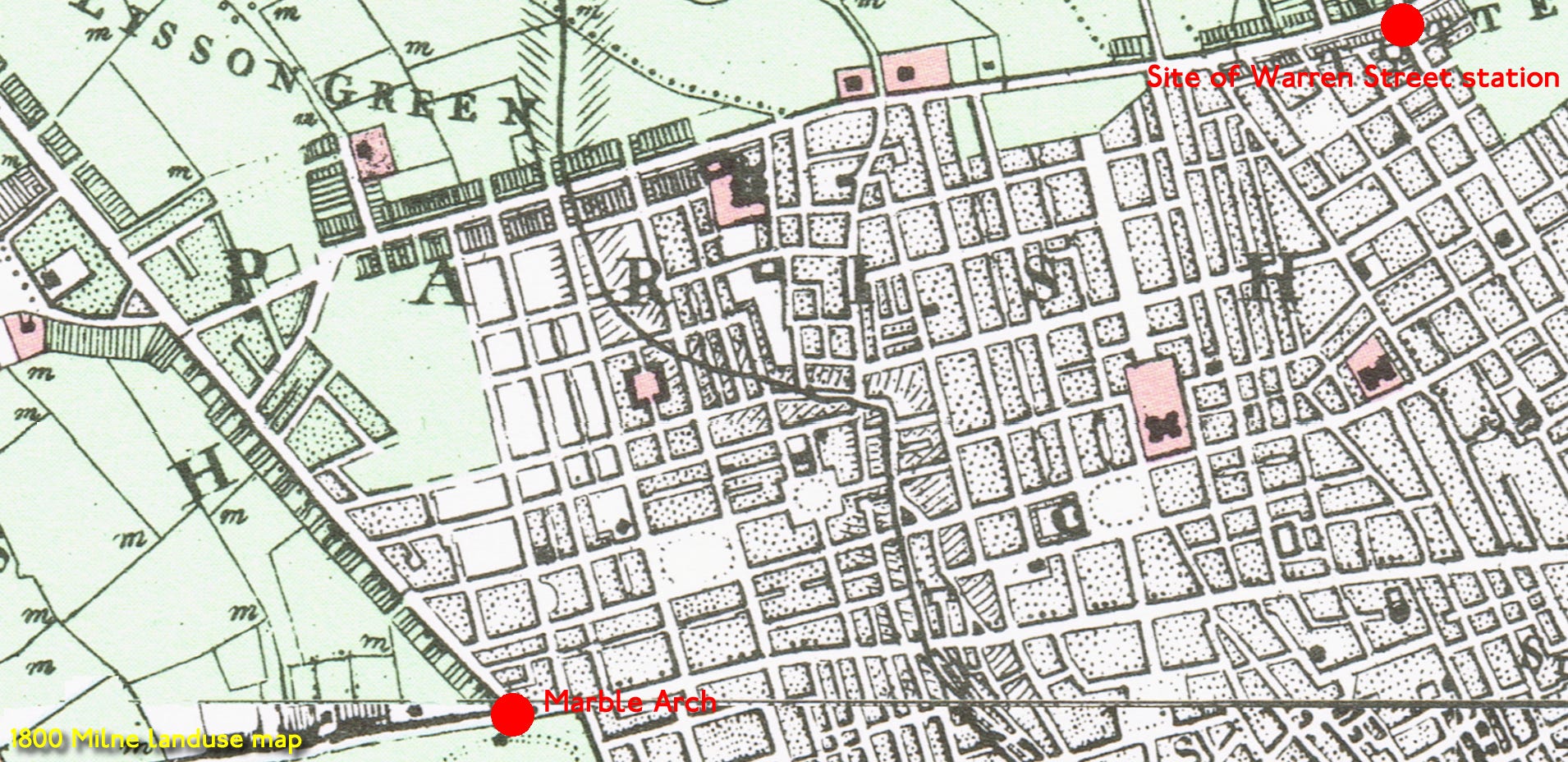 Edgware Road and the New Road - Marylebone Road - define the limit of urban expansion. The cartographer - Milne - shows the River Tyburn crossing his map and through the centre of Marylebone.