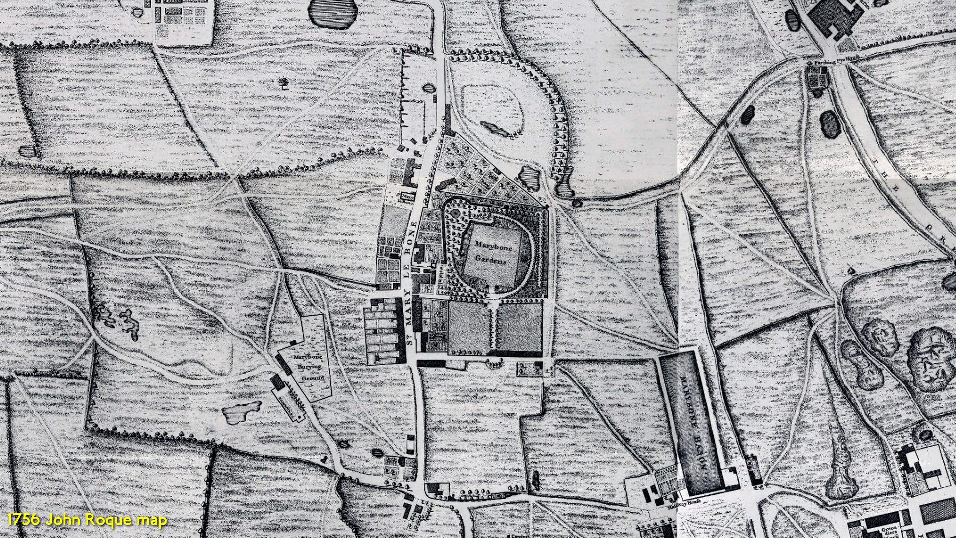 But since this was countryside very near the metropolis, Marylebone Gardens appears on the Rocque map. This was a popular 18th-century pleasure garden and operated from around 1650 to 1778 - one of several fashionable entertainment venues that flourished in London during this period.